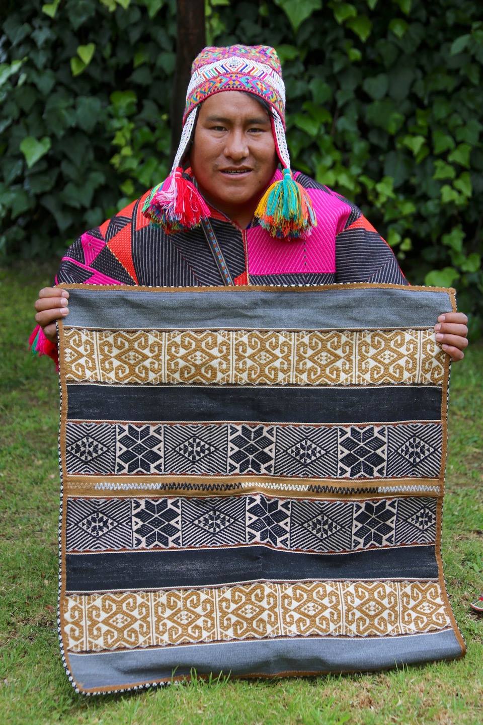 Santos Machacca Apaza, my Q’ero liaison, showing one of his wife Remigia’s weavings.