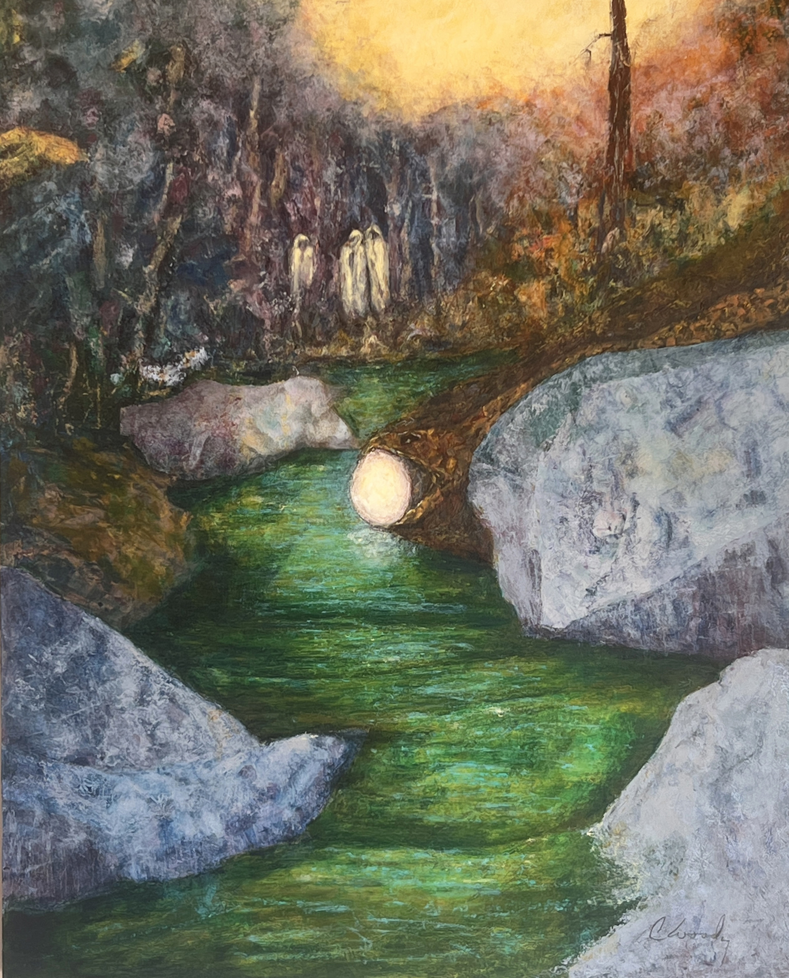 I usually have a sense of what narrative I want to convey before I start painting. Early this year I began a series called One Mother as an invitation to re-member ourselves and our collective foundation. When I started the second work, it quickly diverged from the Arizona forest image I used as a prompt and took on a life of its own. I went with it. After some weeks I realized the landscape seemed awfully familiar but quite different from what I started with, nowhere around here. I couldn’t put my finger on it, and whatever was directing my palette knife wasn’t giving any hints. I have a rocker I keep across the room from my easel. I hang out there a lot, gazing at my work to get distance and another perspective. I knew something significant was missing from this piece but no clue as to what. Then one day two things happened in quick succession. Suddenly, I recognized the landscape as that below the cliff at Serpent Mound in southern Ohio. An instant later, superimposed on the painting, I saw a snake slithering along a large rock at the creek’s edge, the cosmic egg in its mouth.
